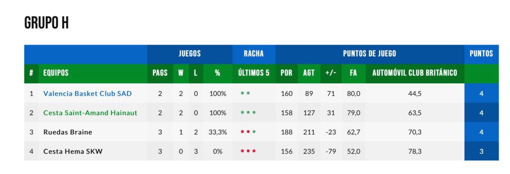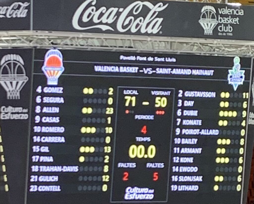 Valencia Basket, cerraría, esta primera fase; en el Grupo H, enfrentándose, a Saint Amand Hainaut; y la lucha por el liderato del grupo, en juego; con la primera parte, del objetivo cumplida; ambos conjuntos, llegarían invictos, al encuentro; y Valencia Basket, sería; hasta el momento, quién encabezaría la serie del grupo; dependiendo del resultado final, podría, pasar a la siguiente fase, en primera; o segunda posición, pero en su caso, el objetivo, de pasar, lo tendría cumplido, tras haber ganado con gran solvencia, los dos encuentros previos; el conjunto galo, también habría hecho su trabajo, por lo que el resultado de este encuentro, sería importante, par ambos conjuntos.