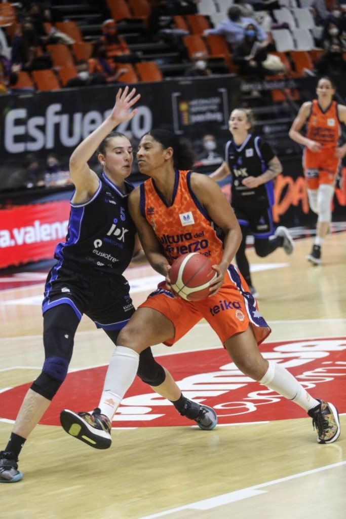 Valencia basket, estaría mostrándose cómodo, en pista, lo que permitía, que circulasen el balón con precisión y eficacia, y a su vez, en defensa, se mostrase con firmeza, trabase parte de ataques de IDK, que no cesaría en su intento, por remontar, y volver a poner a su favor el marcador, como lo habrían tenido durante la primera parte; tres triples seguidos, en los últimos momentos del duelo, pondrían el broche final a este encuentro, el primero, de Leticia, para (78-64), seguiría Juskaite, (81-65), y el último de la serie, de Tirera, con el que finalizaría el duelo por la posición de PO; que haría perder su plaza a un combativo IDK, con el resultado (81-68).