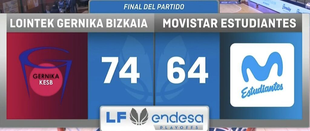 Lointek Gernika 74 : Laura Cornelius (4), Angela Bjorklud (4), Margaret Roundtree (7), Nadia Colhado (18), Rosó Buch (14), – Quinteto inicial – Belén Arrojo (9), Milica Ivanovic (2), Paula Ginzo (4), Itziar Ariztmuño (5), Nogaye Lo (7).MoviStar Estudiantes 64 : Melisa Gretter (13), Leslie Knight (14), Antonye Nyingifa (9), Paola Burani (4), Arica Carter (10), – Quinteto inicial – Gracia Alonso de Armiño (2), Carmen Grande, (-), María Espín (-), Sofia Gomes (9), Jana Raman (3).Árbitros: Sandra Sánchez González, Juan Fco. González Cuervo, José Javier Marqueta GraciaMarcadores parciales: 12-15; 24-18; (36-33 al descanso); 17-11; 21-20; (74-64 final del encuentro.)Incidencias: Partido correspondiente a la vuelta de los cuartos de final de los PlayOff de la LFEndesa, que se disputaría en el Polideportivo Maloste.