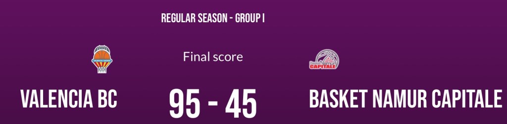 A nivel de equipo, Valencia repartiría 27 asistencias, y 11 Namur; capturarían 34 y 39 rebotes totales, pérdidas, 7 y 29, tapones 5-0., y 16 y 5 robos de balón.