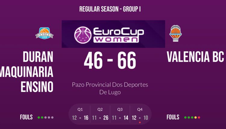 Marcadores parciales: 12-16, 11-26, ( 23-42 al descanso); 11-14, 12-10, ( 46-66 ) victoria para Valencia Basket, que le permitiría mantenerse invicta, y seguir primeras de grupo tras el duelo, Europeo con sabor a LFndesa, en el que Durán Maquinaria Ensino, sumaría la derrota en casa.
