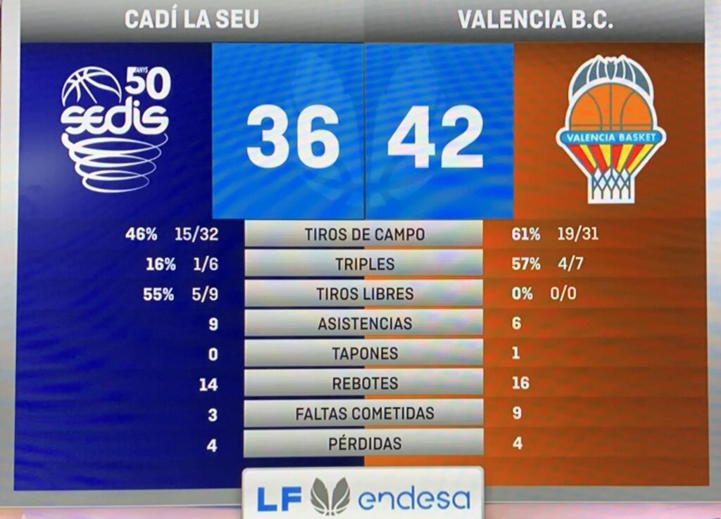 Sería Ensino, quien reaccionaría, con un triple de Lizarazu, y una penetración de Prieto; Queralt respondería, e iniciaría un intercambio, que permitiría a Ensino igualar el marcador a (29); un descuido defensivo local, permitiría a White, a poner a su equipo por delante, parándolo de inmediato el técnico local, a falta de 4’40 para el descanso; sería Allen, de tres, quien invertiría de nuevo el marcador, y tras White responder desde la misma distancia, robarían en el saque para ponerse de nuevo arriba, Valencia estaría siendo presionada defensivamente, y no encontraría acierto, mientras Ensino seguiría sumando, para poner el +10 visitante, que recortaría Salvadores, desde 6’75, Gil, penetraría tras robar, pero no lograría que el balón entrase, sí lo haría Aliaga desde 6’75, para ir al descanso (35-45).
