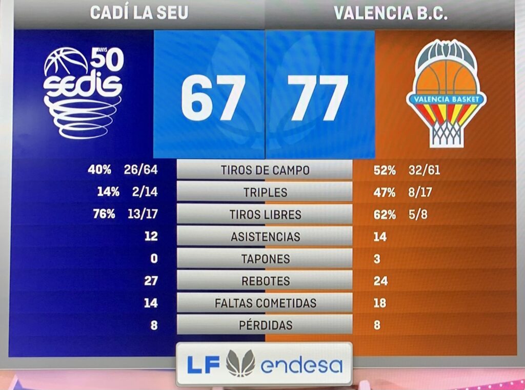 Las máximas anotadoras, serían con 19 puntos Allen, y White, con 16; 4 rebotes capturarían Allen y Gülich, siendo todos defensivos de la primera, y 1 de la segunda; Sofía Gomes Da Silva, capturaría 5, de los que 3 serían defensivos; 4 asistencias repartiría Queralt, y 3 Bahí; 4 recuperaciones sumarían Queralt y Gil, 5 Orsili; 2 tapones cometería Allen y White; y 5 FP recibirían Ouviña y Gülich, 3 Da Silva.