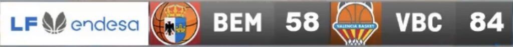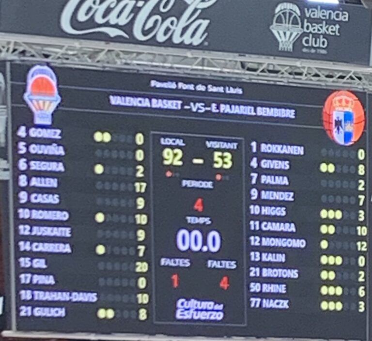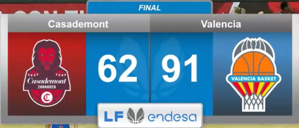 Valencia Basket 82 : Cristina Ouviña (10); Ángela Salvadores (15); Bec Allen (19); Marie Gülich (12); Celeste Trahan-Davis (4); – Quinteto inicial – Anna Gómez (-); Claudia Contell (-); Emily Kalenik (-); Leticia Romero(5); Queralt Casas (6); Laura Gil (11); Durán Maquinaria Ensino 65 : Alba Prieto (4); María Erauncetamurgil (4); Alessandra Orsili (12); Chatrice White (16); Georgina Bahí (-); – Quinteto inicial – Marina Lizarazu (7); Laura Aliaga (6); Sofía Da Silva (10); Natalie Van Den Adel (5).Árbitros: Francisco Javier Bravo Logroño, Eric Carrera Rosdevall y Cristina Adan RodriguezMarcadores parciales: 21-16, 14-29, ( 35-45 al descanso); 23-8, 24-12, ( 82-65 ) victoria para Valencia Basket, que le permitiría así, sumar una nueva victoria.Incidencias: 13ª Jornada de LFEndesa, nuevo duelo que disputarían Valencia Basket y Durán Maquinaria Ensino , el segundo en el Pabellón Municipal La Fonteta en dos semanas.