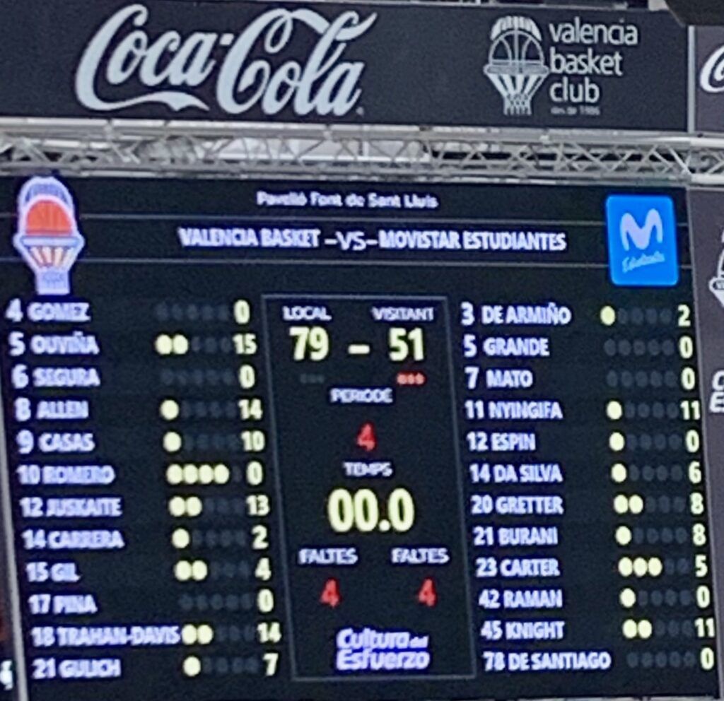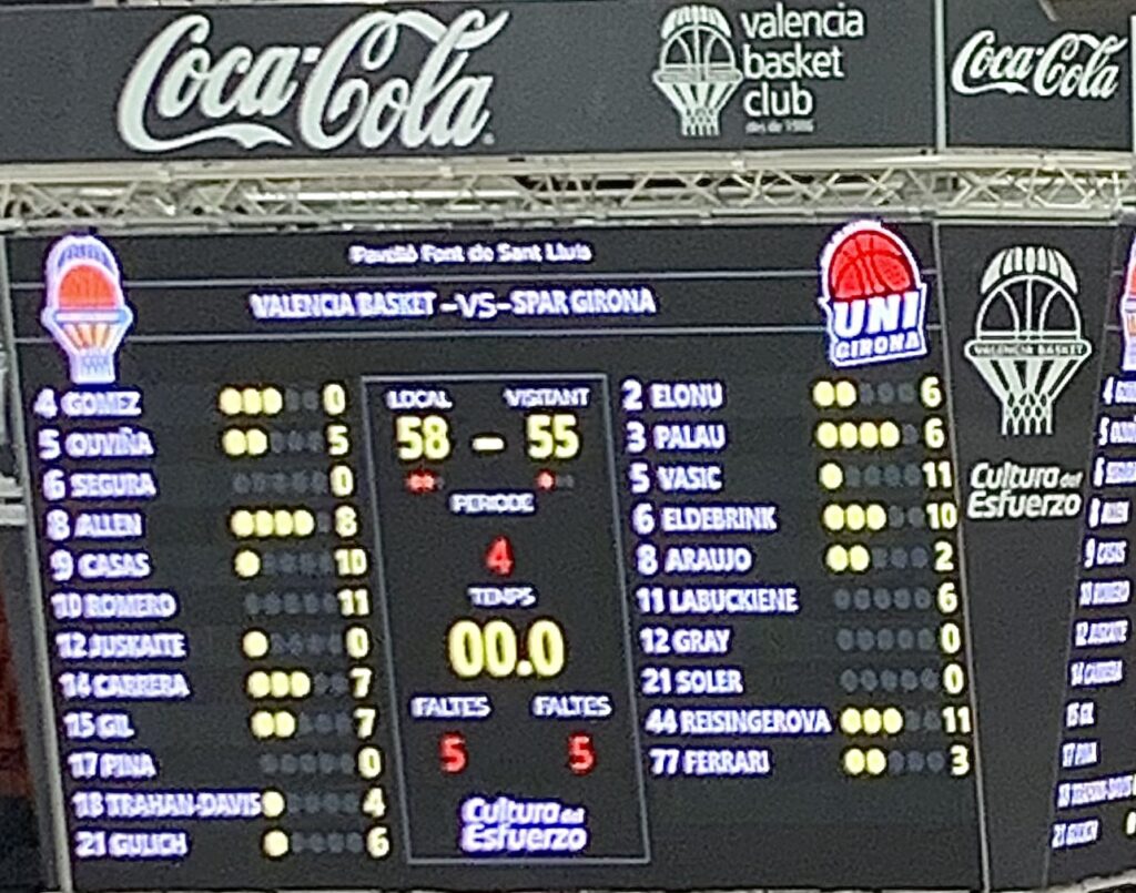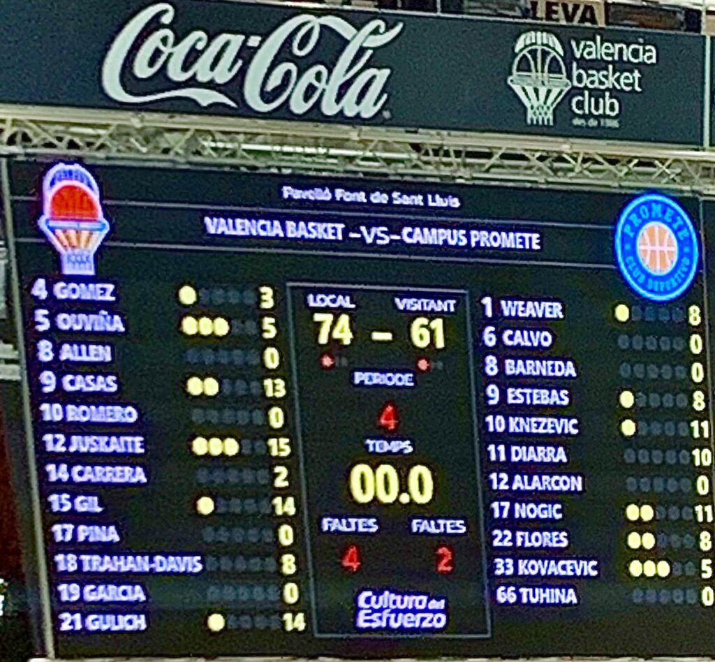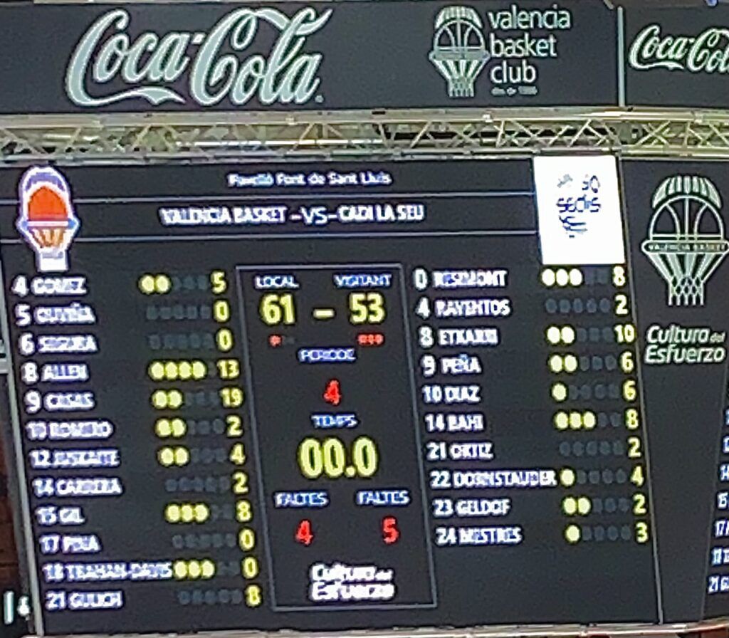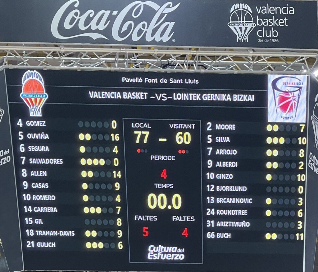 Ouviña no fallaría de TL, pero perderían la posesión tras agotar la misma, Bahí, a falta de 4 minutos, cometería FP sobre Allen, que sería la 5ª de equipo, visitando la línea de TL, desde donde tampoco perdonaría, dejando la diferencia en +4 para Ensino; Valencia subiría la intensidad defensiva, y Ensino también agotaría la posesión; Gülich recortaría a 2 la diferencia, y ante el nerviosismo visitante, Allen desde 6’75, pondría el +1 local., que revertiría Orsili, con dos TL, a lo que respondería Gülich, con 2+1.