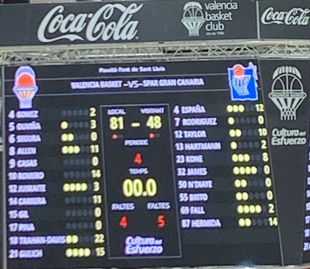 Allen volvería a la línea de TL, tras recibir FP lanzando de tres, convirtiendo los 3 adicionales, Ensino sumaría su segunda canasta del período, y el banquillo local solicitaría TM a 3’54 para finalizar, con un período de (17/4); Salvadores, pondría el +20 local, una FP sobre Gülich, que habría vuelto a pista, obligaría al banquillo visitante a solicitar TM antes de que la jugadora local visitase la línea de TL, Da Silva, muy bien defendida, lograría sumar para su equipo, que no tiraría la toalla , con un triple en el último minuto, que valencia respondería, para finalizar (82-65).