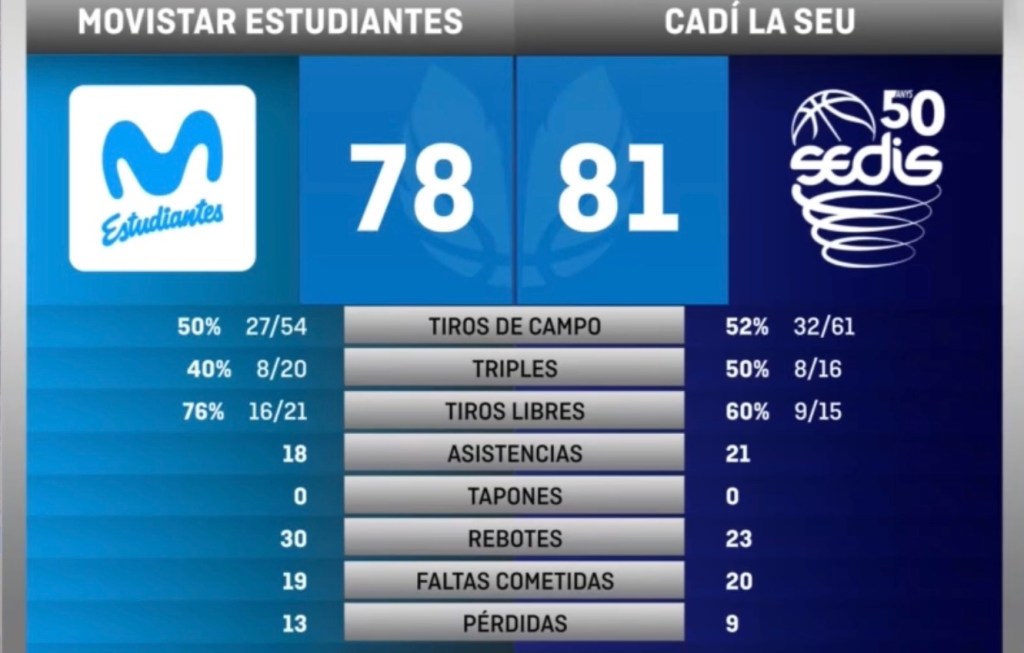 Como máximas anotadoras, estarían por el conjunto local Salvadores y Allen, con 7 puntos cada uno, 11 llevaría White por Ensino, 10/14, sería el balance de rebotes, siendo de ellos, 9 y los 14 defensivos; asistencias habrían repartido 10 y 11, logrando 5 y 3 recuperaciones de balón, ante 5 y 9 pérdidas, habría cometido un tapón cada conjunto y acumularían 4 y 6 FP, con 34 y 53 de valoración total de los equipos.