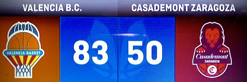 Los porcentajes, serían 73/53% de acierto en tiro de campo; 33/46% en triple, 25/80% en TL; asistencias, 15 y 9; rebotes, 20 y 12; y 5 pérdidas de Valencia, ante 8 de Zaragoza.